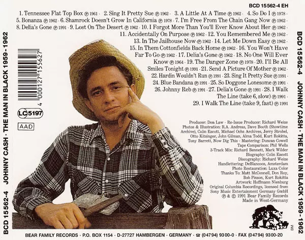 Johnny Cash: The Man In Black • 1959-'62 verzia na 5CD/Box Set v štandardný edícii. Toto konkrétne vydanie vyšlo v Německu vo vydavateľstve Bear Family Records roka 2000. Album zasahuje do žánrov Rock, Folk, World, & Country, Country a Country Rock.
