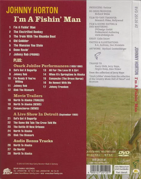 Johnny Horton: I'm A Fishin' Man CLR verzia na DVD v kolorované edícii. Toto konkrétne vydanie vyšlo v Německu vo vydavateľstve Bear Family Records dňa 30. augusta 2012. Album zasahuje do žánrov Rock, Folk, World, & Country, Country a Rockabilly.