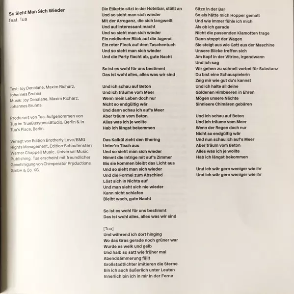 Featuring Tua | Lyrics By Johannes Bruhns, Joy Denalane, Maxim Richarz | Music By Johannes Bruhns, Joy Denalane, Maxim Richarz | Producer Tua | Recorded By Tua
