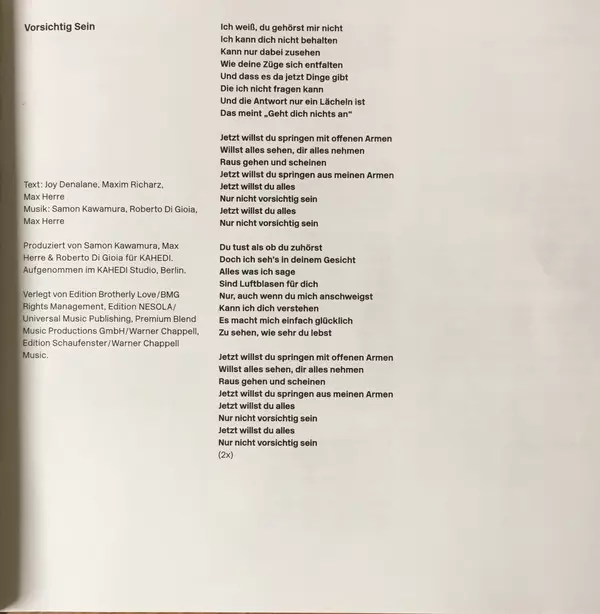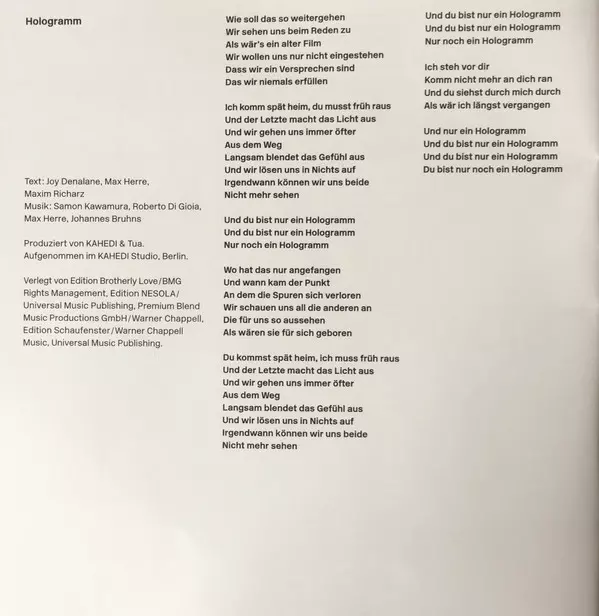 Lyrics By Alexander Zuckowski, Joy Denalane, Martin Fliegenschmidt | Music By Alexander Zuckowski, Benjamin Bazzazian, David Jürgens, Joy Denalane, Martin Fliegenschmidt | Producer Benjamin Bazzazian, KAHEDI | Producer [Additional Production] Derek von Krogh | Recorded By [Additional Instruments] Derek von Krogh
