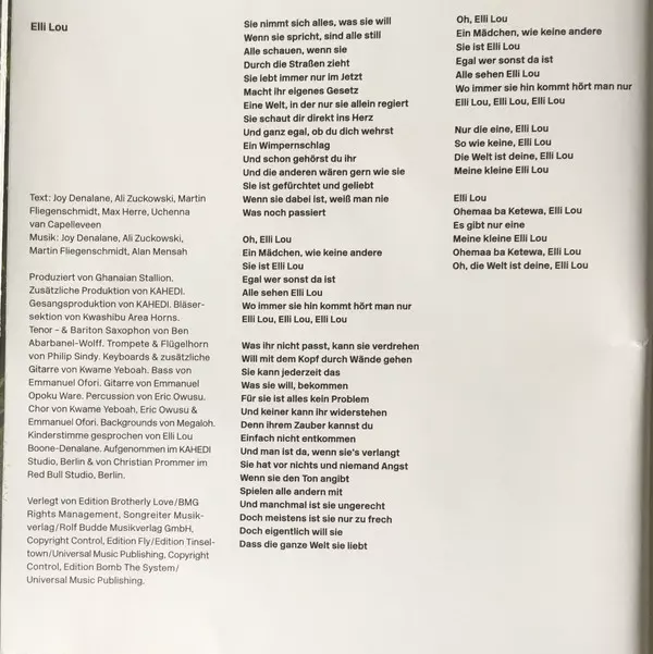Backing Vocals Megaloh | Backing Vocals [Backgrounds] Megaloh | Bass Emmanuel Kwadjo Ofori | Guitar Emmanuel Opoku Ware | Horns Kwashibu Area Band | Keyboards, Guitar [Additional] Kwame Yeboah | Lyrics By Alexander Zuckowski, Joy Denalane, Martin Fliegenschmidt, Max Herre, Uchenna van Capelleveen | Music By Alan Mensah, Alexander Zuckowski, Joy Denalane, Martin Fliegenschmidt | Percussion Eric Sunday Owusa | Producer Ghanaian Stallion | Producer [Additional Production] KAHEDI | Producer [Vocal Production] KAHEDI | Recorded By [Red Bull Studio, Berlin] Christian Prommer | Tenor Saxophone, Baritone Saxophone Ben Abarbanel-Wolff | Trumpet, Flugelhorn Philip Sindy | Vocals [Choir] Emmanuel Kwadjo Ofori, Eric Sunday Owusa, Kwame Yeboah | Voice [Childs Voice Spoken By] Elli Lou Boone-Denalane