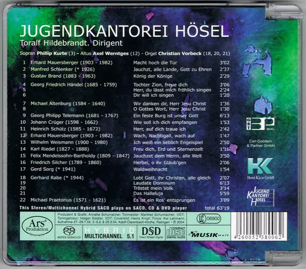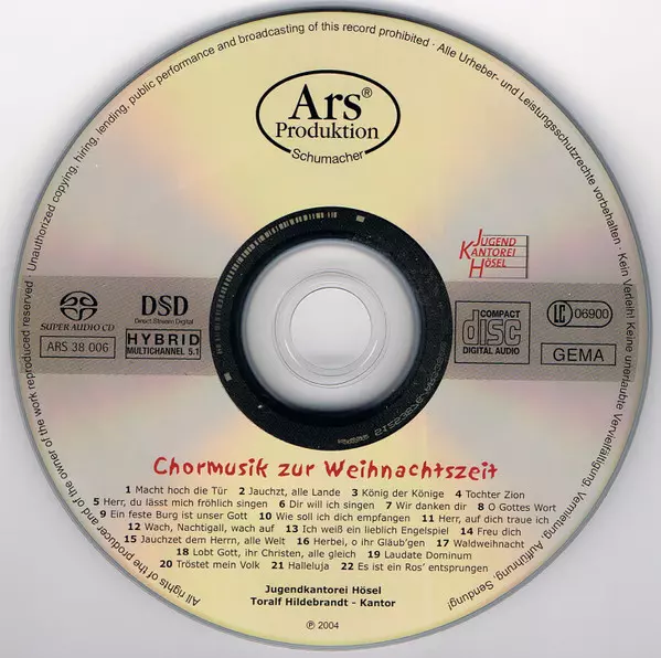 Jugendkantorei Hösel: Chormusik Zur Weihnachtszeit verzia na SACD v štandardný edícii. Toto konkrétne vydanie vyšlo v Německu vo vydavateľstve Ars Produktion roka 2009. Album zasahuje do žánrov Klasická hudba a Choral.