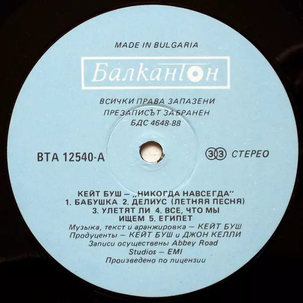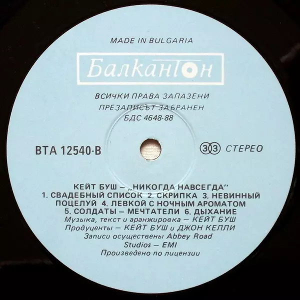 Kate Bush: Never For Ever verzia na vinylu LP v štandardný edícii. Toto konkrétne vydanie vyšlo v Bulharsko vo vydavateľstve Балкантон v spolupráci s EMI roka 1988.