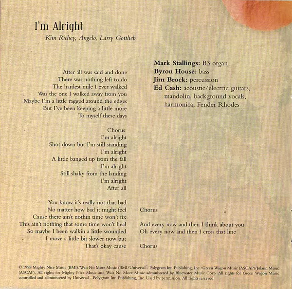 Acoustic Guitar, Electric Guitar, Mandolin, Backing Vocals [Background Vocals], Harmonica, Electric Piano [Fender Rhodes] Ed Cash | Bass Byron House | Organ [B3 Organ] Mark Stallings | Percussion Jim Brock | Written-By Angelo Petraglia, Kim Richey, Larry Gottlieb