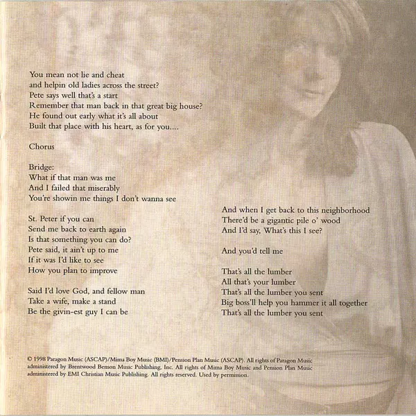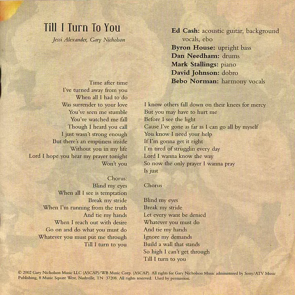 Acoustic Guitar, Backing Vocals [Background Vocals], E-Bow [Ebo] Ed Cash | Dobro David Johnson (22) | Double Bass [Upright Bass] Byron House | Drums Dan Needham | Harmony Vocals Bebo Norman | Piano Mark Stallings | Written-By Gary Nicholson, Jessi Alexander