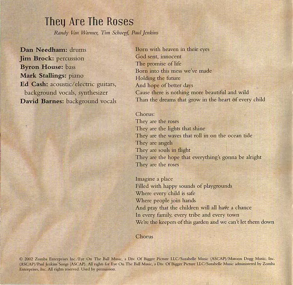 Acoustic Guitar, Electric Guitar, Backing Vocals [Background Vocals], Synthesizer Ed Cash | Backing Vocals [Background Vocals] Dave Barnes | Bass Byron House | Drums Dan Needham | Percussion Jim Brock | Piano Mark Stallings | Written-By Paul Jenkins (3), Randy Vanwarmer, Tim Schoepf