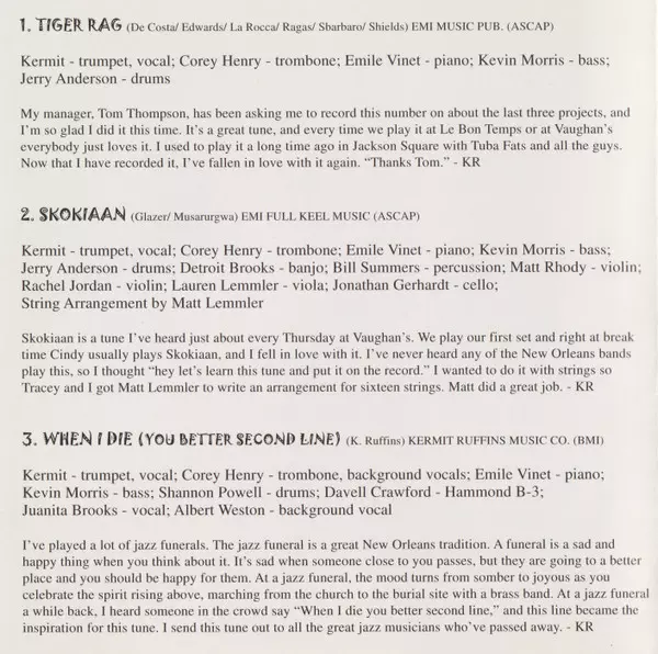 Backing Vocals Alfred Weston (2) | Bass Kevin Morris (7) | Drums Herlin Riley | Piano Emile Vinette | Tenor Saxophone Eric Traub | Trombone, Backing Vocals Corey Henry | Written-By Kermit Ruffins