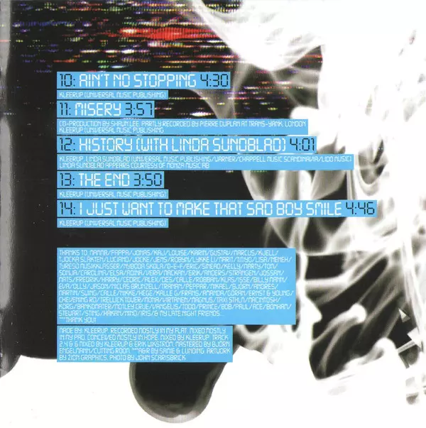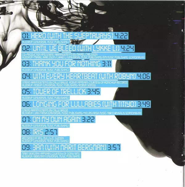 1 - Hero 4:22min 2 - Until We Bleed 4:24min 3 - Thank You For Nothing 3:11min 4 - With Every Heartbeat 4:06min 5 - Tower Of Trellick 3:45min 6 - Longing For Lullabies 3:49min 7 - On My Own Again 3:22min 8 - Iris 2:57min 9 - 3AM 3:57min 10 - Ain't No Stopping 4:30min 11 - Misery 3:57min 12 - History 4:01min 13 - The End 3:50min 14 - I Just Want To Make That Sad Boy Smile 4:46min