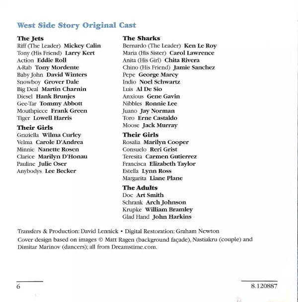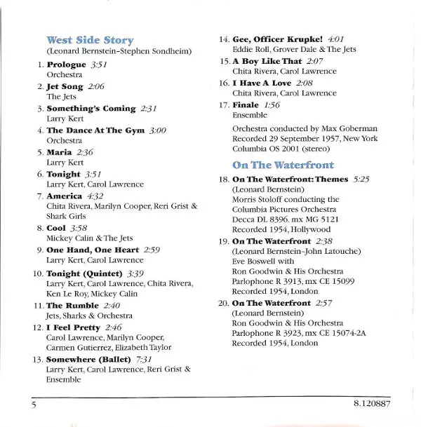| Interpret | Leonard Bernstein | Chita Rivera | Carol Lawrence | Jerome Robbins | Larry Kert | Arthur Gordon Smith |