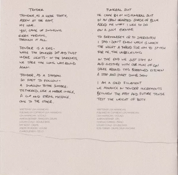 Cello Clarice Jensen | Double Bass Logan Coale | Drums Ray Rizzo | Piano, Synthesizer [OP1], Drums Aaron Dessner | Violin André de Ridder | Vocals Lisa Hannigan | Written-By Lisa Hannigan