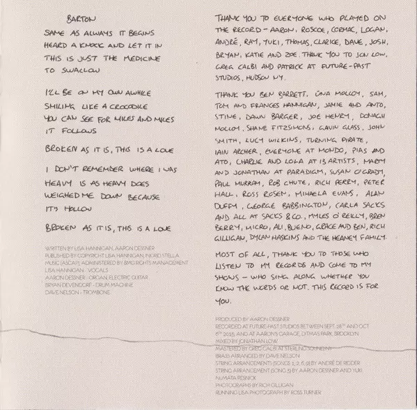 Double Bass Logan Coale | Drums Ross Turner | Guitar, Electric Piano [Rhodes] Aaron Dessner | Piano Cormac Curran | Trombone Dave Nelson (7) | Vocals, Guitar Lisa Hannigan | Written-By Lisa Hannigan