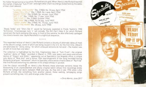 Little Richard: Here's Little Richard DLX verzia na 2CD v deluxe edícii. Toto konkrétne vydanie vyšlo v USA vo vydavateľstve Craft Recordings v spolupráci s Specialty dňa 10. novembra 2017. Album zasahuje do žánrov Rock, Blues, Rhythm & Blues a Rock & Roll. 60th Anniversary Deluxe Edition.