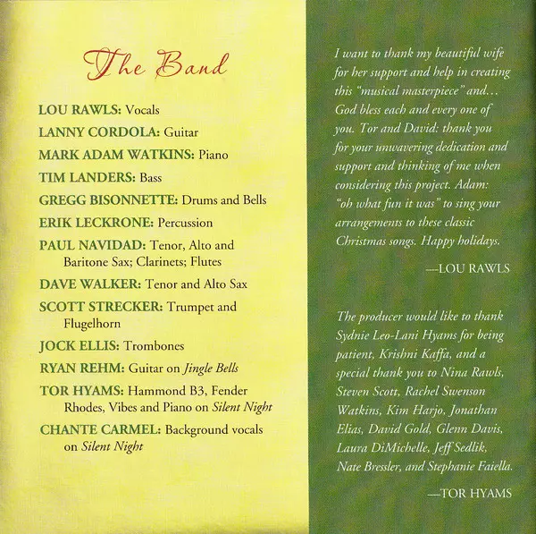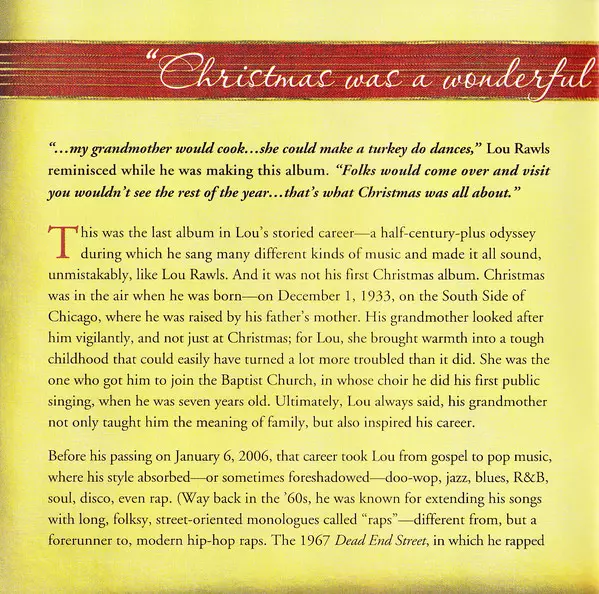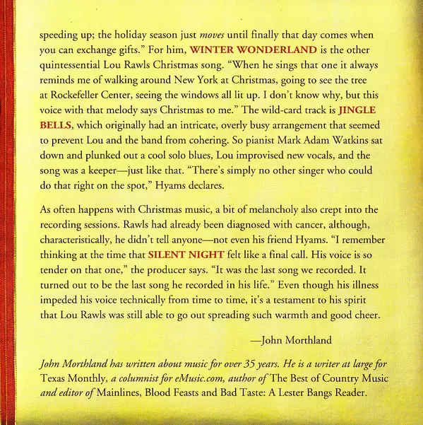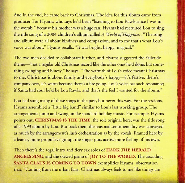 Lou Rawls: Christmas verzia na CD v štandardný edícii. Toto konkrétne vydanie vyšlo v USA vo vydavateľstve Time Life. Album možno zaradiť do žánru Jazz.