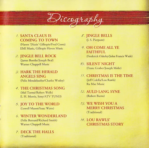 1 - Santa Claus is Coming to Town 2 - Jingle Bell Rock 3 - Hark the Herald Angels Sing 4 - The Christmas Song 5 - Joy to the World 6 - Winter Wonderland 7 - Deck the Halls 8 - Jingle Bells 9 - Oh Come All Ye Faithful 10 - Silent Night 11 - Christmas is the Time 12 - Auld Lang Syne 13 - We Wish You a Merry Christmas 14 - Lou Rawls' Christmas Story