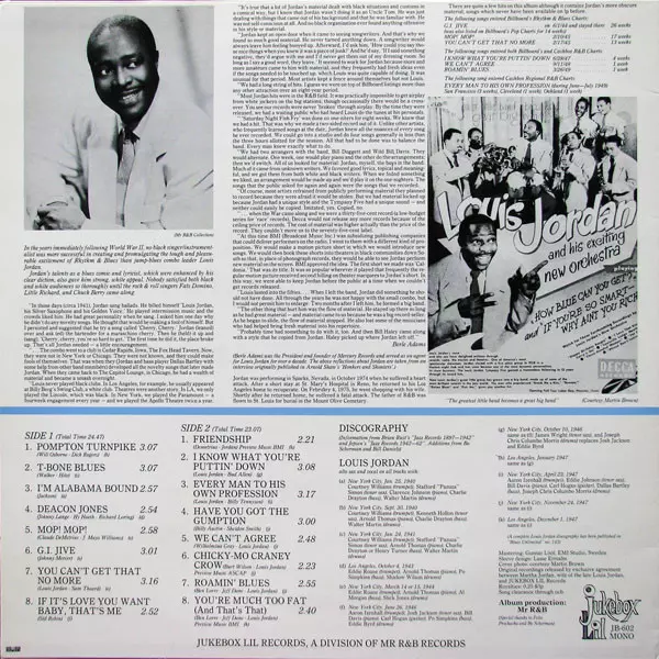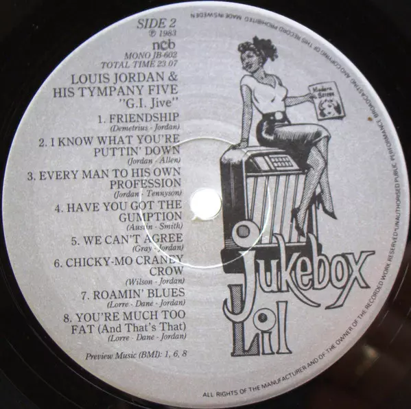 Louis Jordan And His Tympany Five: G.I. Jive 1940-47 verzia na vinylu LP v štandardný edícii. Toto konkrétne vydanie vyšlo v Švédsku vo vydavateľstve Jukebox Lil dňa 25. decembra 1999. Album zasahuje do žánrov Blues, Jazz a Rhythm & Blues.
