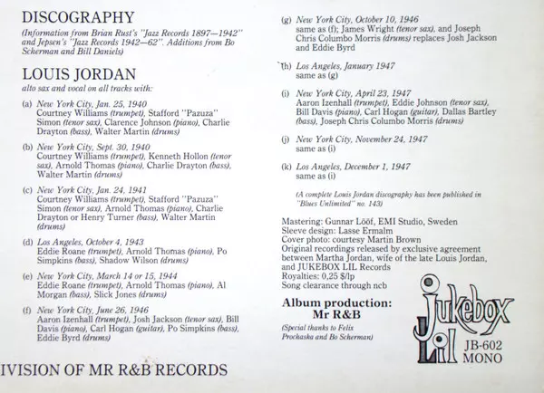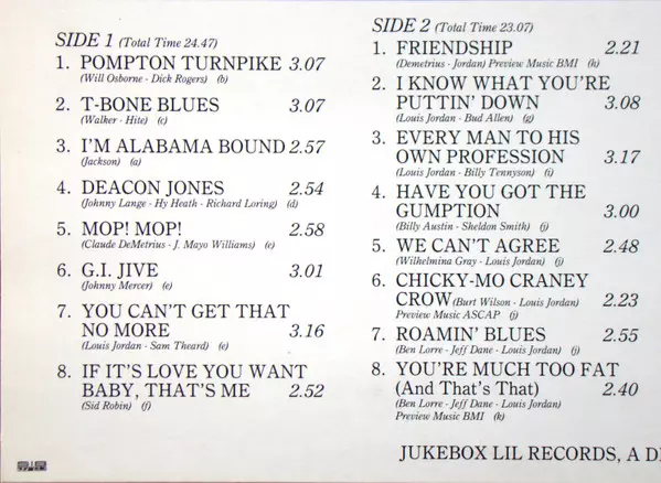 Bass Jesse Simpkins | Drums Chris Columbo | Guitar Carl Hogan | Piano Wild Bill Davis | Tenor Saxophone James Wright (2) | Trumpet Aaron Izenhall | Written-By Claude DeMetrius, Louis Jordan