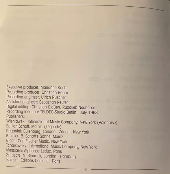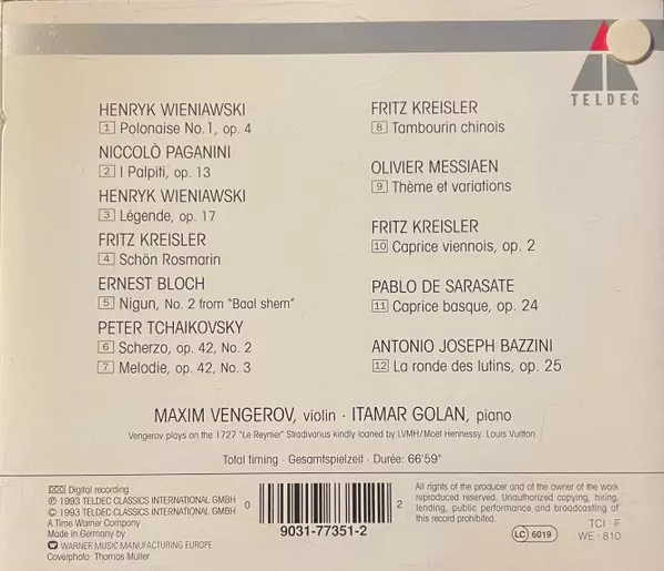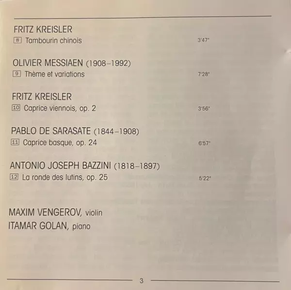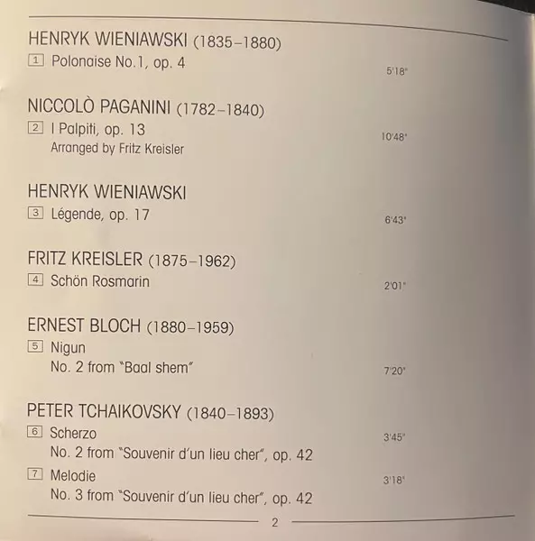 | Interpret | Pyotr Ilyich Tchaikovsky | Niccolò Paganini | Olivier Messiaen | Pablo De Sarasate | Henryk Wieniawski | Fritz Kreisler | Ernest Bloch | Maxim Vengerov | Antonio Bazzini |