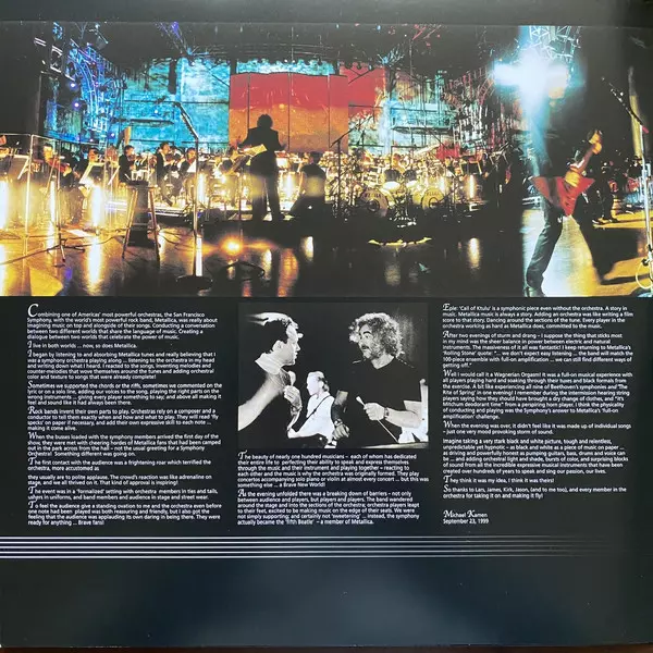 S&M (eine Abkürzung für Symphony and Metallica) ist ein Live-Album mit dem San Francisco Symphony unter der Leitung von Michael Kamen. Es wurde am 21. und 22. April 1999 im Berkeley Community Theatre aufgenommen. Dies ist das letzte Metallica-Album, auf dem Jason Newsted als Bassist von Metallica zu hören ist. Die Idee, Heavy Metal mit einem epischen klassischen Ansatz zu kombinieren, wie James Hetfield wiederholt erklärt hat, war eine Idee von Cliff Burton. Burtons Liebe zur klassischen Musik, insbesondere zu Johann Sebastian Bach, lässt sich auf viele instrumentale Teile und melodische Merkmale in Metallicas Songwriting zurückführen, darunter Lieder aus Ride The Lightning und Master of Puppets. Michael Kamen, der die orchestralen Hintergrundtracks für "Nothing Else Matters" arrangierte und dirigierte, traf die Band zum ersten Mal bei der Grammy-Verleihung 1992, und nachdem er die "Elevator-Version" des Songs gehört hatte, schlug er der Band vor, mit einem ganzen Orchester aufzutreten; die Band nahm das Angebot jedoch erst 7 Jahre später an. Lars Ulrichs Lieblingsband Deep Purple, die er 2016 auf charmante Weise in die Rock and Roll Hall of Fame aufnahm, ist bekannt dafür, dass sie diese Art von Annäherung bereits 30 Jahre zuvor in Concerto for Group and Orchestra (1969) begonnen hat. Neben Songs von früheren Alben, die Ride the Lightning bis Reload umfassen, gibt es zwei neue Kompositionen: "No Leaf Clover" und "-Human". "The Ecstasy of Gold" von Ennio Morricone, die Eingangsmusik von Metallica, wurde vom Orchester gespielt live. "No Leaf Clover" wurde seither von Metallica im Konzert aufgeführt, wobei eine Aufnahme des Orchestervorspiels verwendet wurde. Informácie o produkte S&M (skratka pre Symphony and Metallica) je živý album so Sanfranciským symfonickým orchestrom pod vedením Michaela Kamena. Bol nahraný 21. a 22. apríla 1999 v Berkeley Community Theatre. Je to posledný album skupiny Metallica, na ktorom sa ako basgitarista podieľal Jason Newsted. Nápad spojiť heavy metal s epickým klasickým prístupom, ako opakovane uviedol James Hetfield, bol nápadom Cliffa Burtona. Burtonovu lásku ku klasickej hudbe, najmä k Johannovi Sebastianovi Bachovi, možno vysledovať v mnohých inštrumentálnych častiach a melodických charakteristikách v skladbách skupiny Metallica vrátane piesní z albumov Ride The Lightning a Master of Puppets. Michael Kamen, ktorý aranžoval a dirigoval orchestrálny doprovod pre skladbu "Nothing Else Matters", sa so skupinou prvýkrát stretol v roku 1992 na udeľovaní cien Grammy a po vypočutí "výťahovej verzie" skladby navrhol, aby skupina vystúpila s plným orchestrom; skupina však jeho ponuku prijala až o sedem rokov neskôr. Obľúbená skupina Larsa Ulricha Deep Purple, ktorú v roku 2016 farbisto uviedol do Rock and rollovej siene slávy, je známa tým, že s takýmto prístupom začala už o 30 rokov skôr, v Koncerte pre kapelu a orchester (1969). Popri skladbách z predchádzajúcich albumov s rozpätím od Ride the Lightning po Reload sa na albume nachádzajú aj dve nové kompozície: "No Leaf Clover" a "-Human". "The Ecstasy of Gold" od Ennia Morriconeho, vstupnú hudbu Metallicy, zahral orchester naživo. "No Leaf Clover" odvtedy Metallica hral na koncerte, pričom použil nahrávku orchestrálnej predohry. (Wikipedia)