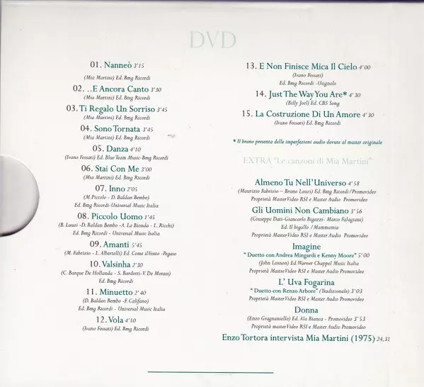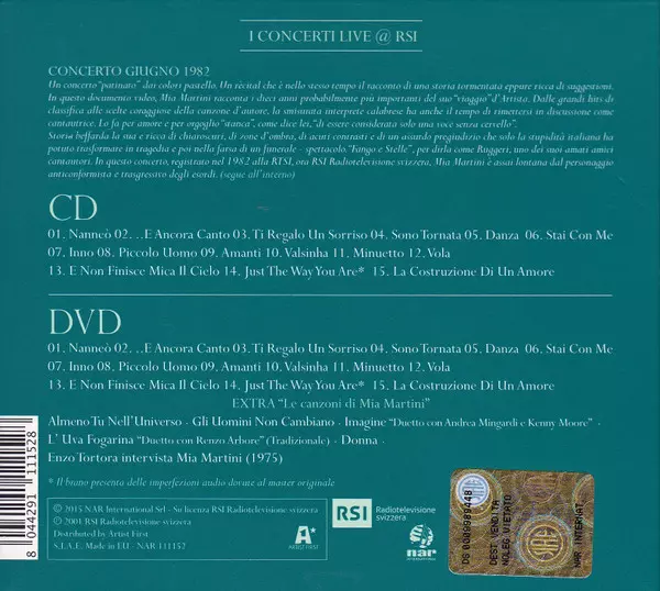 Mia Martini: Live Collection verzia na CD/DVD v remasterované edícii. Toto konkrétne vydanie vyšlo v Itálii vo vydavateľstve NAR International v spolupráci s RSI Radiotelevisione Svizzera dňa 25. septembra 2015. Album zasahuje do žánrov Pop a Chanson.