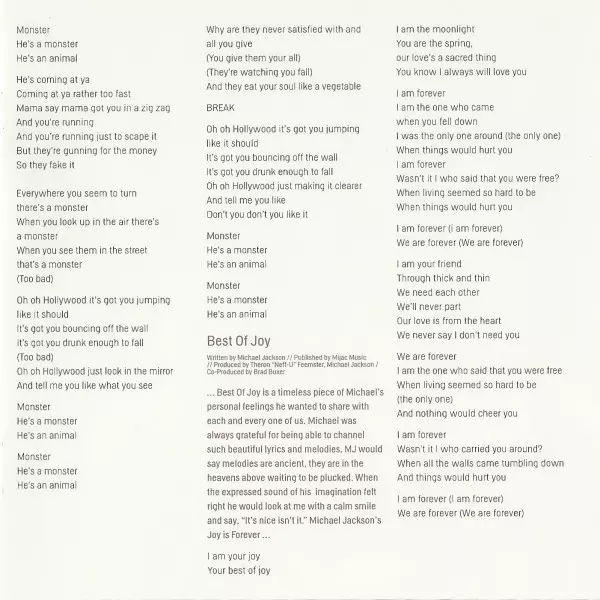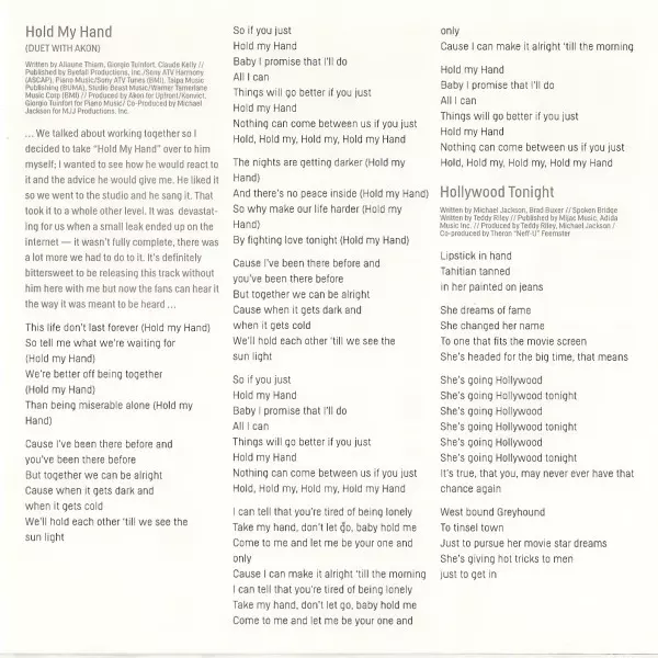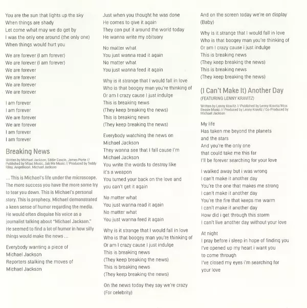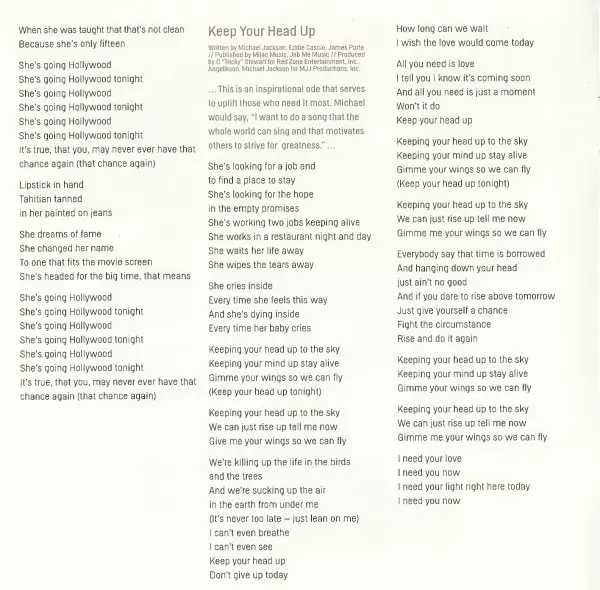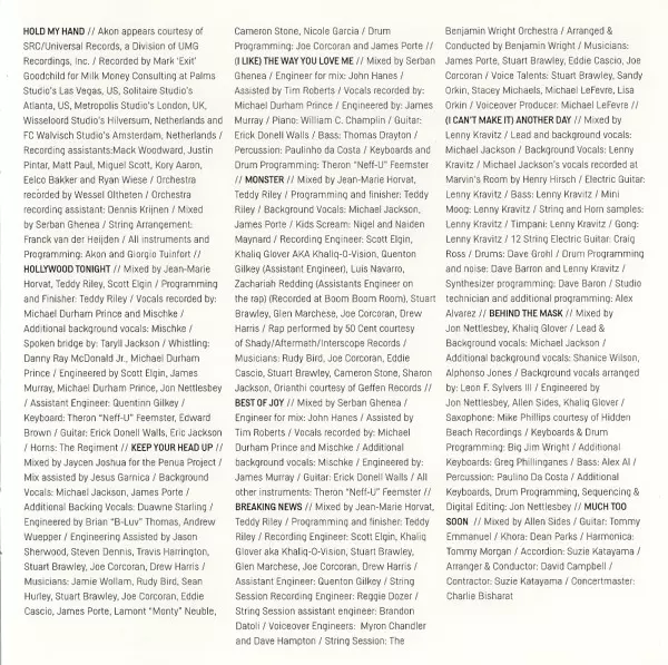 | Arranged By [Strings], Conductor [Strings] Benjamin Wright | Engineer [Assistant] Quentin Gilkey | Engineer [Recording] Drew Harris, Glen Marchese, Joe Corcoran, Khaliq Glover, Khaliq-O-Vision, Scott Elgin, Stuart Brawley | Engineer [String Session Assistant] Brandon Datoli | Engineer [String Session Recording] Reginald Dozier | Engineer [Voiceover] Dave Hampton, Myron Chandler | Mixed By Jean-Marie Horvat, Teddy Riley | Musician Eddie Cascio, James Porte, Joe Corcoran, Stuart Brawley | Producer Angelikson, Michael Jackson, Teddy Riley | Producer [Voiceover] Michael LeFevre | Programmed By, Other [Finisher] Teddy Riley | Strings The Benjamin Wright String Orchestra | Voice [Talents] Lisa Orkin, Michael LeFevre, Sandy Orkin, Stacey Michaels, Stuart Brawley | Written-By Eddie Cascio, James Porte, Michael Jackson | |||