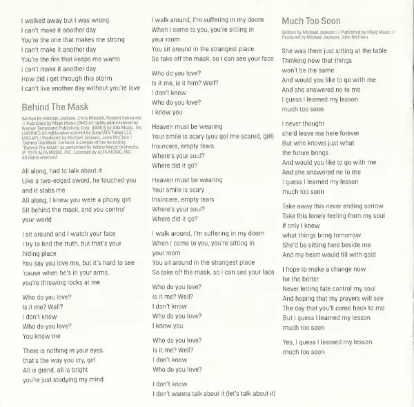 | Arranged By [Background Vocals] Leon Sylvers | Backing Vocals [Additional] Alphonso Jones, Shanice Wilson | Bass Alex Al | Drum Programming James "Big Jim" Wright, Jon Nettlesbey | Engineer Allen Sides, Jon Nettlesbey, Khaliq Glover | Keyboards James "Big Jim" Wright | Keyboards [Additional] Greg Phillinganes, Jon Nettlesbey | Lead Vocals, Backing Vocals Michael Jackson | Mixed By Jon Nettlesbey, Khaliq Glover | Percussion Paulinho Da Costa | Producer John McClain, Michael Jackson | Saxophone Mike Phillips (8) | Sequenced By, Edited By [Digital Editing] Jon Nettlesbey | Written-By Chris Mosdell, Michael Jackson, Ryuichi Sakamoto | |||
