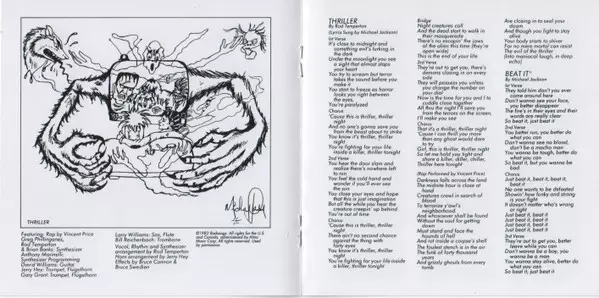 Arranged By [Horn Arrangement] Jerry Hey | Arranged By [Vocal, Rhythm And Synthesizer Arrangement] Rod Temperton | Effects Bruce Cannon, Bruce Swedien | Featuring, Rap Vincent Price (2) | Guitar David Williams (4) | Programmed By [Synthesizer Programming] Anthony Marinelli | Saxophone, Flute Larry Williams | Synthesizer Brian Banks, Greg Phillinganes, Rod Temperton | Trombone Bill Reichenbach (2) | Trumpet, Flugelhorn Gary Grant, Jerry Hey | Vocals [Lyrics Sung By] Michael Jackson | Written-By Rod Temperton