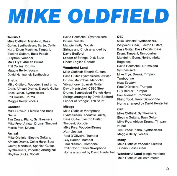 Arranged By [Horns] David Hentschel | Tenor Saxophone Phil Todd | Trombone Paul Nieman | Trumpet Guy Barker, Raul D'Oliveira | Vibraphone, Synthesizer, Acoustic Guitar, Bass Guitar, Electric Guitar, Timpani, Vocoder Mike Oldfield | Vocoder, Drums Mike Frye | Written-By Mike Oldfield