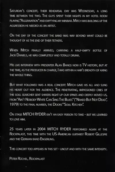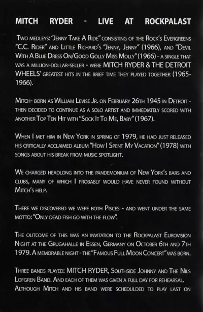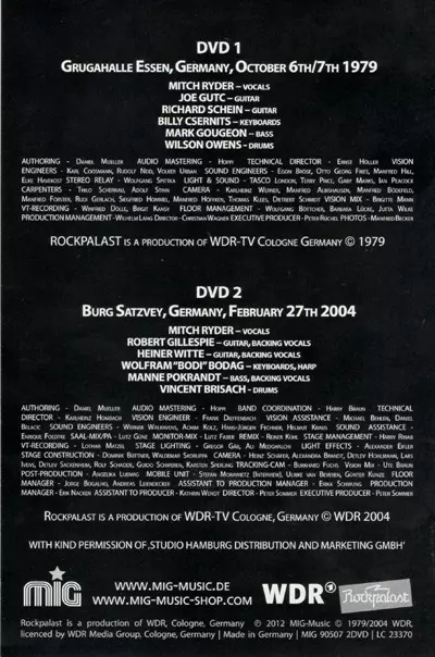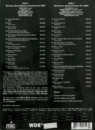 Mitch Ryder: Live At Rockpalast 1979 + 2004 verzia na 2DVD v štandardný edícii. Toto konkrétne vydanie vyšlo v Německu vo vydavateľstve MIG dňa 8. januára 2016. Album zasahuje do žánrov Rock, Rhythm & Blues a Rock & Roll.