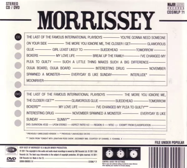 Morrissey: Very Best Of verzia na CD/DVD v remasterované edícii. Toto konkrétne vydanie vyšlo v Velké Británii vo vydavateľstve Major Minor dňa 3. mája 2011. Album zasahuje do žánrov Rock, Alternatívny rock a Brit Pop. Digi Sleeve.