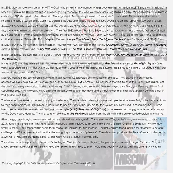 Moscow: Too Light To Be Late CLR verzia na vinylu 2LP v kolorované edícii. Toto konkrétne vydanie vyšlo v Velké Británii vo vydavateľstve Bin Liner Records dňa 31. októbra 2025. Album zasahuje do žánrov Rock, Post-Punk a Indie Rock.