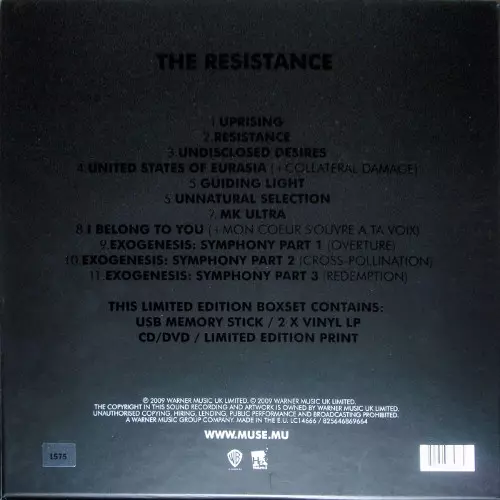 Muse: The Resistance LTD | NUM verzia na vinylu 2LP/CD/2DVD/Box Set v limitované individuálne číslované edícii. Toto konkrétne vydanie vyšlo v Evropě a UK vo vydavateľstve Warner Bros. Records v spolupráci s Helium 3 dňa 11. septembra 2009.