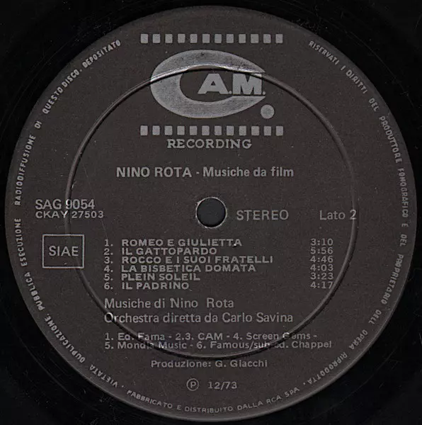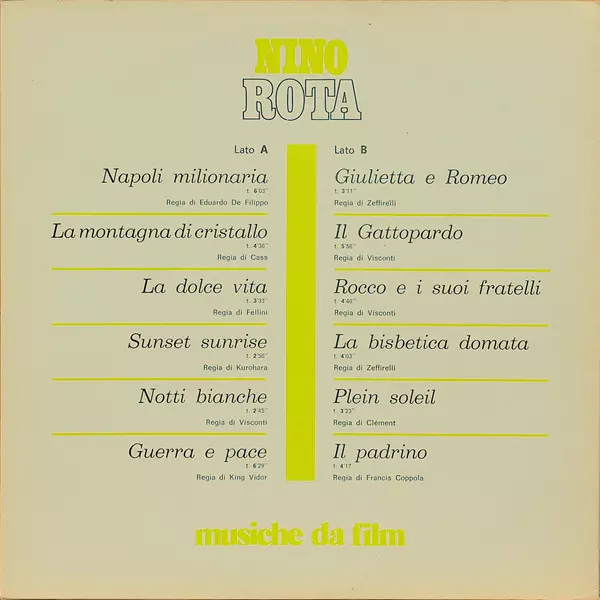 Nino Rota: Musiche Da Film verzia na vinylu LP v štandardný edícii. Toto konkrétne vydanie vyšlo v Itálii vo vydavateľstve CAM roka 1974. Album zasahuje do žánrov Stage & Screen a Soundtrack.
