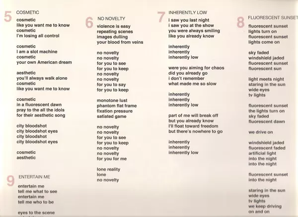 A1 - Blank Reflection A2 - Rat King A3 - Cold Line A4 - New Structures A5 - Cosmetic B6 - No Novelty B7 - Inherently Low B8 - Fluorescent Sunset B9 - Entertain Me