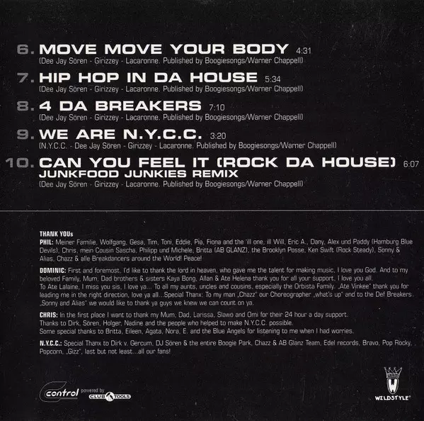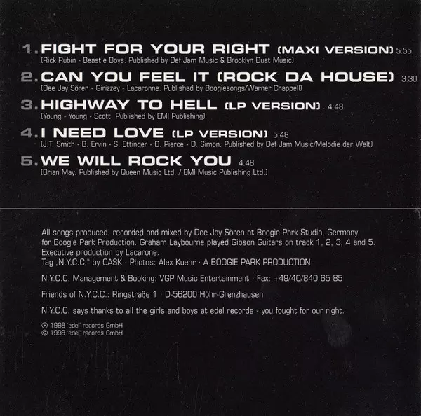 N.Y.C.C.: Greatest Hits verzia na CD v štandardný edícii. Toto konkrétne vydanie vyšlo v Německu vo vydavateľstve Control dňa 10. júla 1998. Album zasahuje do žánrov Elektronická hudba, Hip Hop, Rock & Roll, Euro House a Hip-House.