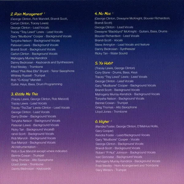 Bass Lige Curry | Clavinet [Clav], Piano, Strings, Electric Piano, Synthesizer, Synthesizer [Synth Bass], Synthesizer [Pads] Danny Bedrosian | Drums Benjamin Cowan | Guitar Blackbyrd McKnight, Trafael Lewis | Guitar, Vocals Garrett Shider | Vocals Bouvier Richardson, Brandi "Nakid" Scott, Clip Payne, Patavian Lewis, Tairee Parks, Tonysha Nelson, Tracey Lewis-Clinton | Written-By Anthony Caruso (2), Brandi "Nakid" Scott, Ebony Houston, Gilberto R Fuentes, LaShonda Clinton, Novena Carmel, Tairee Parks, Tracey Lewis, Tracey Lewis-Clinton | Written-By, Vocals George Clinton