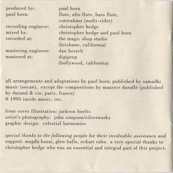 Paul Horn: Music verzia na CD v štandardný edícii. Toto konkrétne vydanie vyšlo vo vydavateľstve Kuckuck dňa 2. novembra 1998. Album zasahuje do žánrov Klasická hudba a Baroková hudba.