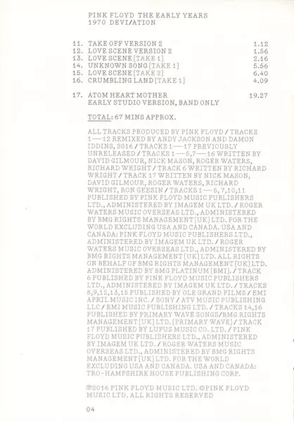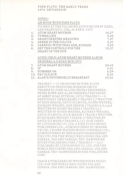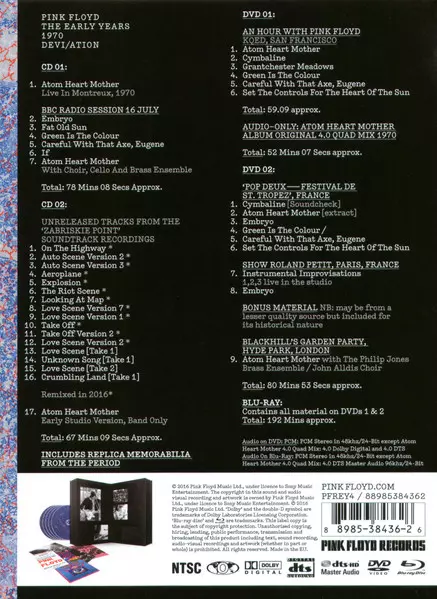 Pink Floyd: The Early Years 1970 Devi/ation verzia na 2CD/2DVD/Blu-ray v štandardný edícii. Toto konkrétne vydanie vyšlo v USA vo vydavateľstve Pink Floyd Records dňa 26. marca 2017. Album možno zaradiť do žánru Rock. Region 0.