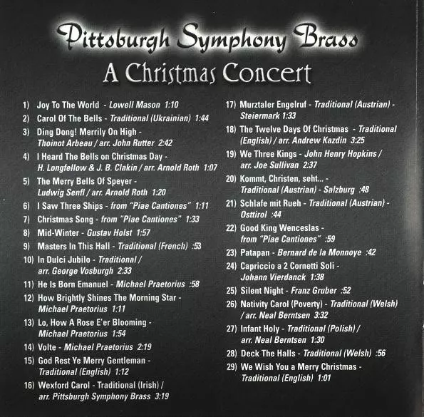 Pittsburgh Symphony Brass: A Christmas Concert verzia na CD v štandardný edícii. Toto konkrétne vydanie vyšlo v USA vo vydavateľstve Four Winds dňa 10. októbra 2000. Album zasahuje do žánrov Klasická hudba, Folk, World, & Country, Baroková hudba, Modernizmus, Romantika, Súčasná klasická hudba, Early, Holiday a Renaissance.