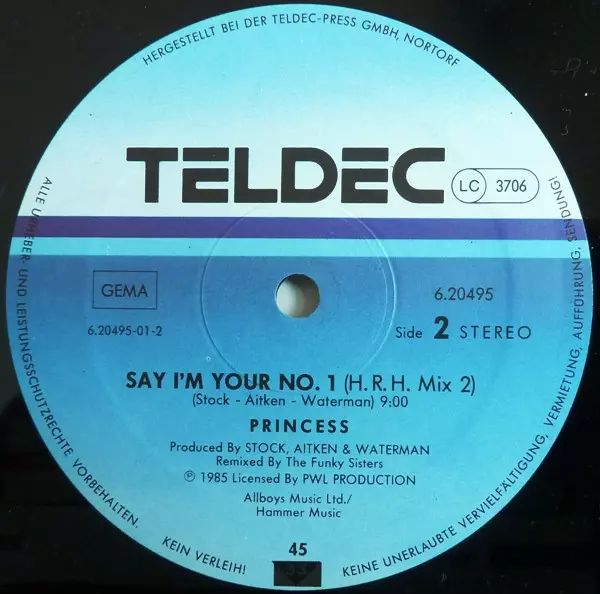 Princess: Say I'm Your No. 1 verzia na vinylu LP v 45 RPM edícii. Toto konkrétne vydanie vyšlo v Německu vo vydavateľstve Teldec roka 1985. Album zasahuje do žánrov Pop, Elektronická hudba a Synth-pop.