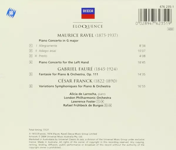 | Interpret | Maurice Ravel | Gabriel Fauré | London Philharmonic Orchestra | Rafael Frühbeck De Burgos | Lawrence Foster | Alicia De Larrocha |