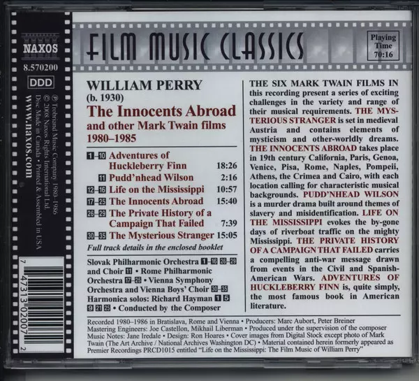 Richard Hayman: The Innocents Abroad / Music for Mark Twain Films verzia na CD v štandardný edícii. Toto konkrétne vydanie vyšlo vo vydavateľstve Naxos dňa 7. apríla 2008. Album zasahuje do žánrov Klasická hudba a Stage & Screen. Filmmusik.