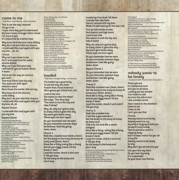 Arranged By, Guitar, Keyboards, Written-By George Noriega | Bass Sal Cuevas | Cello Daniel Smith (4), Larry Corbett, Steve Richards | Cello, Contractor Suzie Katayama | Concertmaster Joel Derouin | Coordinator José Maldonado, Kevin Dillon (4), Leyla Leeming, Steve Menezes | Drums Lee Levin | Engineer Alan Sanderson, Chris Wiggins, Dino Herrmann, Gustavo Bonnet, Jennifer Hilliard, Ken Theis, Roger Gonzalez, Tom Bender | Guitar Manny López, Tim Mitchell | Keyboards, Programmed By Randall Barlow | Lead Vocals Ricky Martin | Percussion Archie Peña | Recorded By Charles Dye, Freddy Piñero, Jr., Gustavo Celis, Steve Churchyard | Strings, Arranged By, Conductor David Campbell | Technician Alex Caballero, Andy Pechenik, Kurt Berge | Viola Carole Mukogawa, Evan Wilson, Matt Funes, Robert Becker | Violin Anatoly Rosinsky, Armen Garabedian, Berj Garabedian, Bob Peterson, Brian Leonard, Charlie Bisharat, Clayton Haslop, Edmund Stein, Eve Butler, Gerardo Hilera, Kenneth Yerke, Mario DeLeon, Michele Richards, Susan Chatman | Written-By James Paul Goodwin, Robi Draco Rosa
