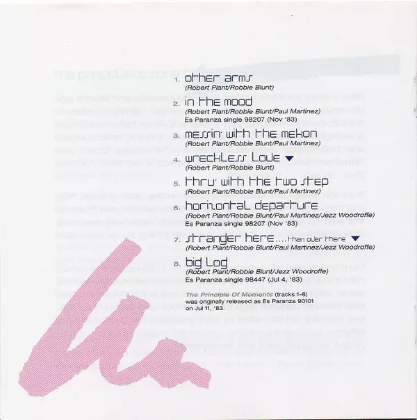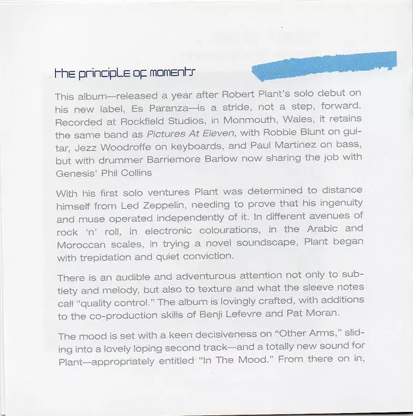 "The Principle of Moments" je druhý sólový štúdiový album Roberta Planta. Phil Collins hral na bicie v piatich z ôsmich skladieb albumu (ako aj v skladbe Pictures at Eleven). Rovnako ako na Plantovom prvom sólovom albume Pictures at Eleven, aj tu boli skladby výrazným odklonom od hardrockového zvuku skupiny Led Zeppelin. Týmto albumom Plant zazn...