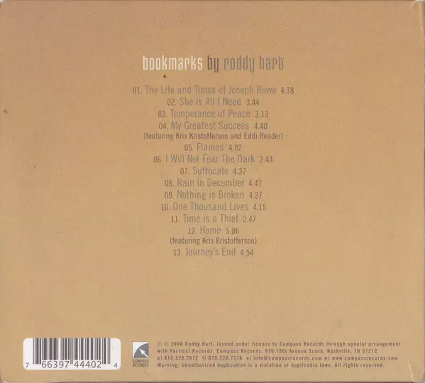 Roddy Hart: Bookmarks verzia na CD v štandardný edícii. Toto konkrétne vydanie vyšlo v USA vo vydavateľstve Compass Records dňa 13. marca 2007. Album zasahuje do žánrov Rock a Folk, World, & Country.