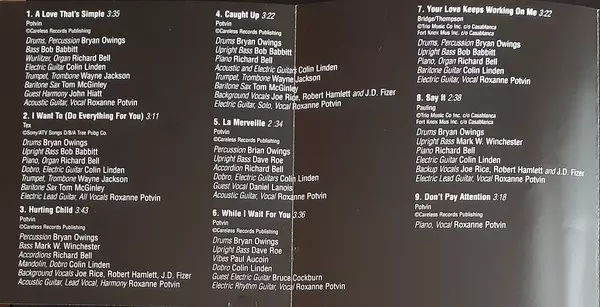 Acoustic Guitar, Vocals Roxanne Potvin | Dobro Colin Linden | Double Bass [Upright Bass] Dave Roe | Drums Bryan Owings | Piano Richard Bell (4) | Vibraphone [Vibes] Paul Aucoin | Written-By Roxanne Potvin
