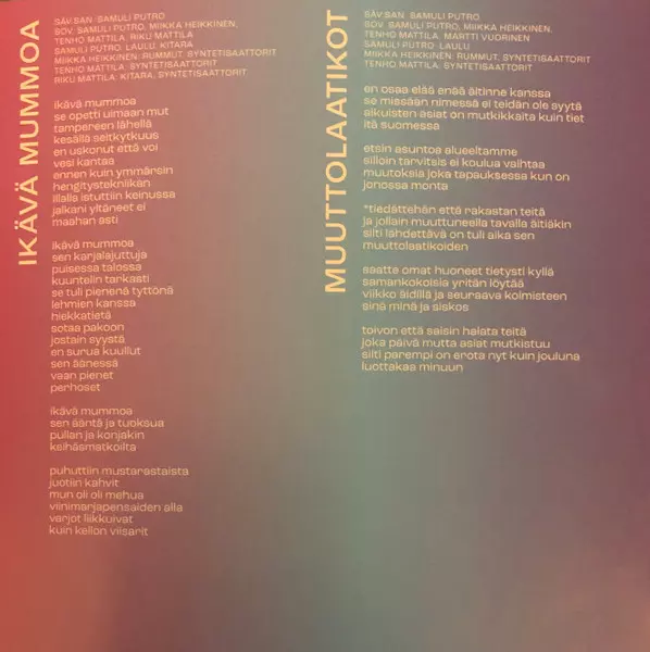 Samuli Putro: Ikävä Mummoa verzia na CD v štandardný edícii. Toto konkrétne vydanie vyšlo v Finsko vo vydavateľstve Johanna Kustannus dňa 10. marca 2023. Album zasahuje do žánrov Rock, Pop, Pop Rock a Indie Pop.