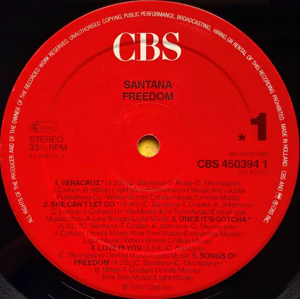 Santana: Freedom verzia na vinylu LP v štandardný edícii. Toto konkrétne vydanie vyšlo v Evropě vo vydavateľstve CBS roka 1987. Album zasahuje do žánrov Rock a Latinská hudba.