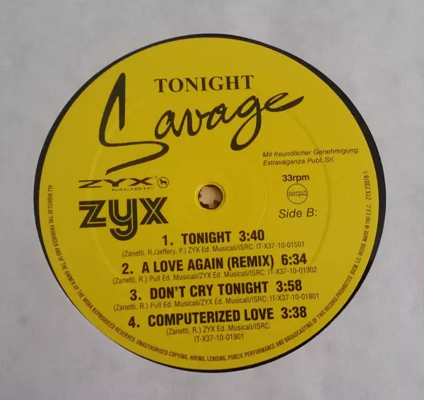 Savage: Tonight verzia na vinylu LP v štandardný edícii. Toto konkrétne vydanie vyšlo v Německu vo vydavateľstve ZYX Music dňa 13. apríla 2017. Album zasahuje do žánrov Elektronická hudba a Italo-Disco.