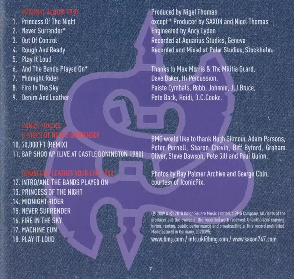 Reedice čtvrtého alba legendy NWOBHM Saxon. "Denim And Leather" je čtvrté studiové album legendární heavymetalové skupiny Saxon, původně vydané v říjnu 1981. Se singly "Princess Of The Night", "Never Surrender" a nahrané v Aquarius Studios v Ženevě, bylo album dosud nejúspěšnějším albem skupiny.