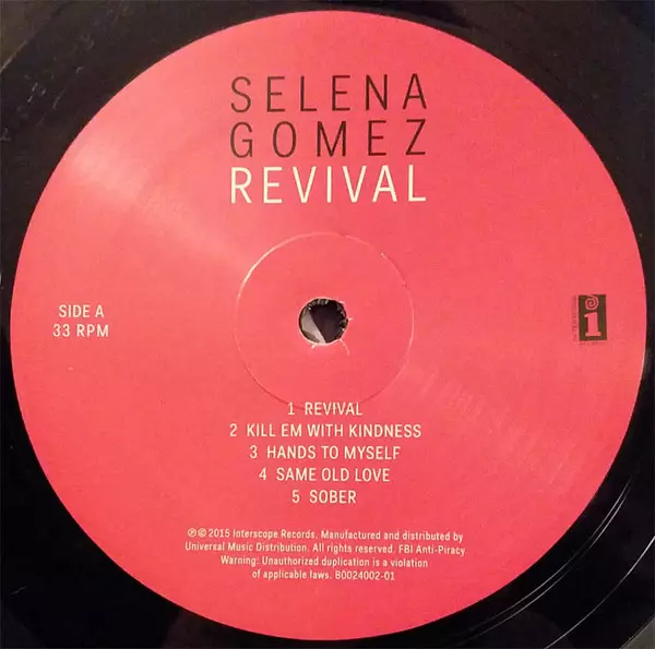 Selena Gomez: Revival verzia na vinylu LP v štandardný edícii. Toto konkrétne vydanie vyšlo v USA vo vydavateľstve Interscope Records dňa 8. januára 2016.
